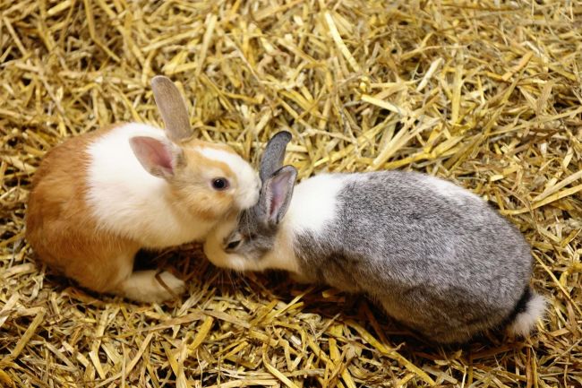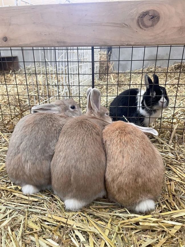 カイウサギの三姉妹、バス、フルート、ビオラ。仲良しの3匹でくっついている後ろ姿がかわいらしい。奥の黒毛はオスのモック。女の子が好きで、隣のゲージにいつも夢中。(同園提供)