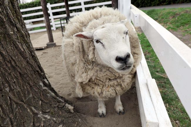 ヒツジのルカ(6歳)はテクセル種の女の子。食べるのが大好きで、口角が上がっているところがチャームポイント。1年分の羊毛で覆われ、「少し暑そう」(飼育員)。5月半ばに毛刈り予定で、モフモフ期間はあと半月