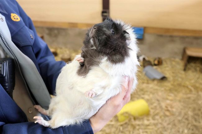 同園のモルモットの中で一番おとなしい、こしあん、3歳。仰向けで抱っこされてもされるがまま。