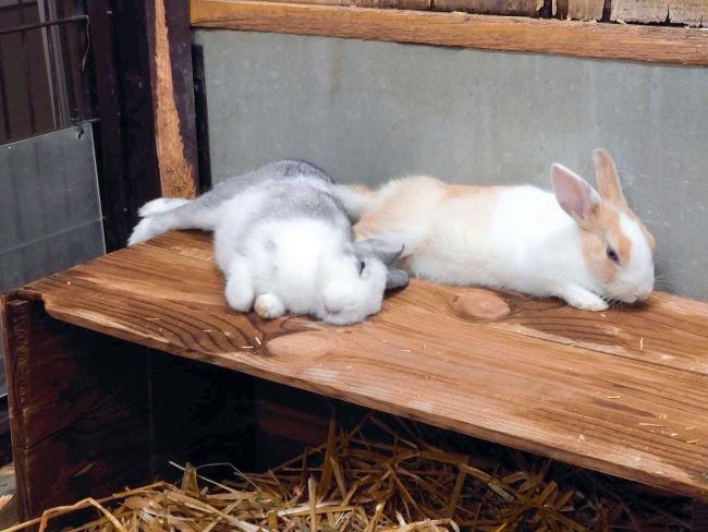 今年1月に生まれたばかりのミニウサギの赤ちゃんなずな(左)とつむぎ(右)。普段はすこし怖がりななずなは寝方が豪快。(同園提供)