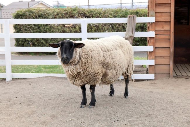 サフォーク種の女の子、ピノ、6歳。怖がりで警戒心が強い。5月半ばに毛刈り予定だが、毛を刈ると少し頭でっかちに。「そんな姿もかわいい」(飼育員)。