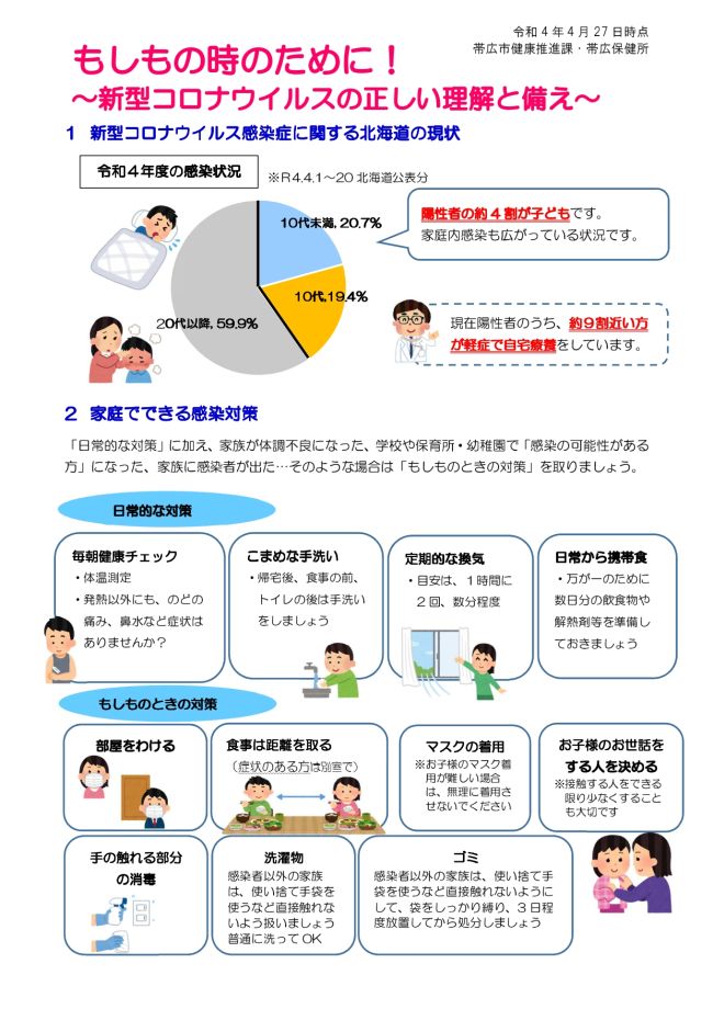 十勝管内で新型コロナウイルスの若年層の感染と家庭内感染が増加していることを受け、帯広市は家庭でできる感染対策と陽性になった場合の対応の流れなどをまとめたリーフレットを作成した。市のホームページ(HP)で掲載している。