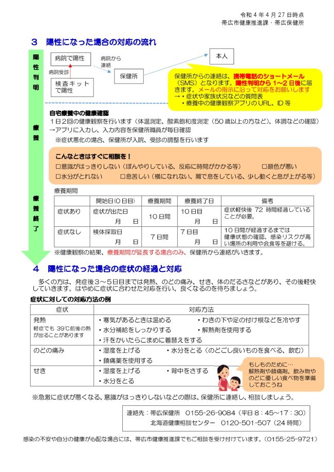 陽性になった場合、陽性判明から1~2日後に保健所から携帯電話で届くショートメールの指示に沿って、症状や家族状況、自宅療養中の健康観察などを行うことを記した。療養期間(症状がある場合は症状が出た日から10日間、症状がない場合は検体採取日から7日間)も掲載した。