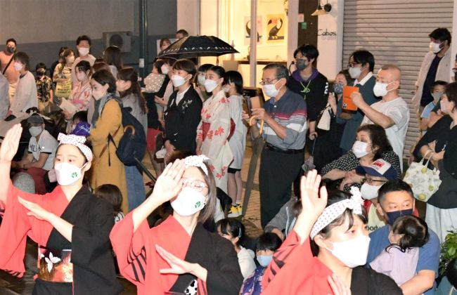 個人参加した市内の及川照子さん(79)はきらびやかな花笠と浴衣を身にまとい、ひときわ目立っていた。30代の頃から出場してきた及川さんは「この日を待っていた。これが私の生きがい」と語り、3年ぶりに披露する舞を孫らが沿道から応援した。