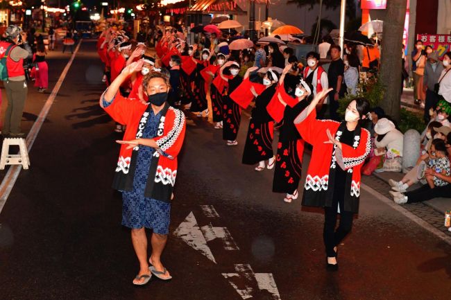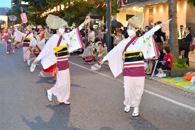 コロナ対策のため、マスク着用や踊り手同士の2メートル間隔の確保など例年との違いの多い盆おどりとなった。歌い手と太鼓の音色に合わせて、400人は浴衣やそろいの衣装、思い思いのコスプレで、一斉に平原通の7~9丁目を周回。久しぶりの盆おどりに、踊り手も観客も笑顔がはじけた。1時間を超えたところで雨足が強まり、予定より30分ほど早く終了した。