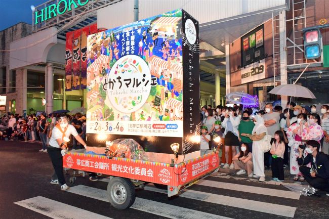 友人と3人で見物に訪れた帯広緑陽高3年の白木咲生さん(17)は「雨は残念だが気持ちはとても盛り上がった」と笑顔。歌い手の加藤恵理奈さんは「踊り手や歌い手の熱量はコロナ前よりもすごかった」と話した。唯一、山車を出した帯広商工会議所観光文化委員会の黒川明彦委員長は「参加団体が少ないと聞いて参加した。委員が資材を持ち寄って手作りしたが、用意できて良かった」と振り返った。