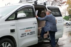 式典の後、自動配送ロボットが運んだはさみを使ってテープカットを行ったほか、実際に西山村長らが自動運転車両に乗って会場から村内の温泉施設まで移動した。