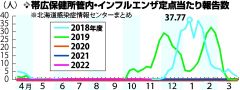 十勝管内では、新型コロナが本格的に流行した20年3月初旬以降、インフルエンザ患者数が低水準で推移する。道感染症情報センターのまとめによると、管内13定点医療機関で確認された患者数は、20年秋~21年春で計2人、21年秋~22年春はゼロ。今季も24日までの報告ではゼロだ。