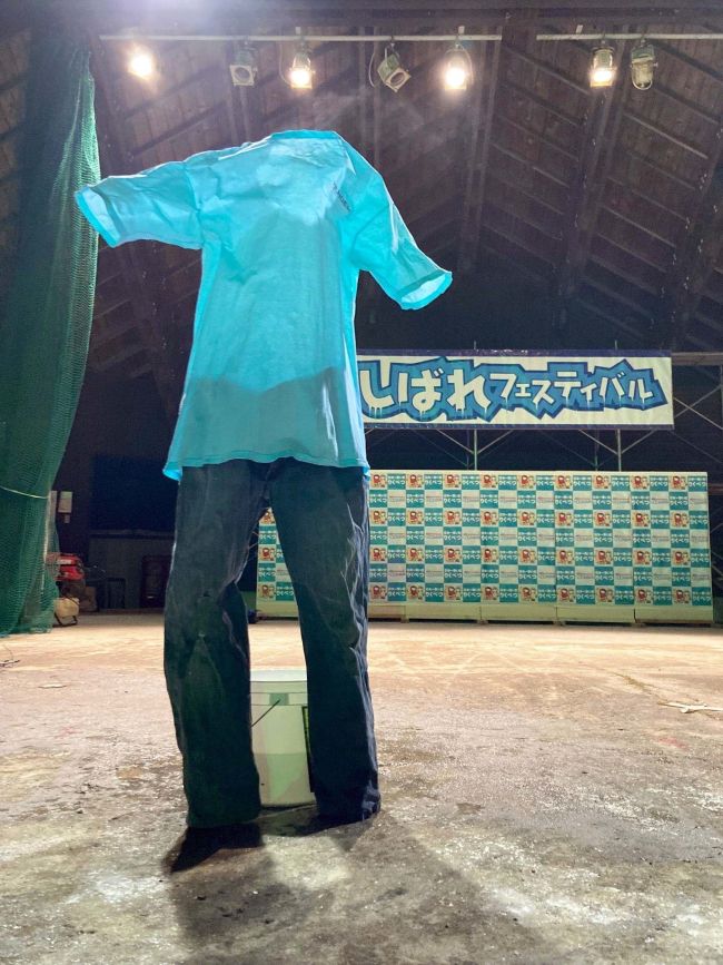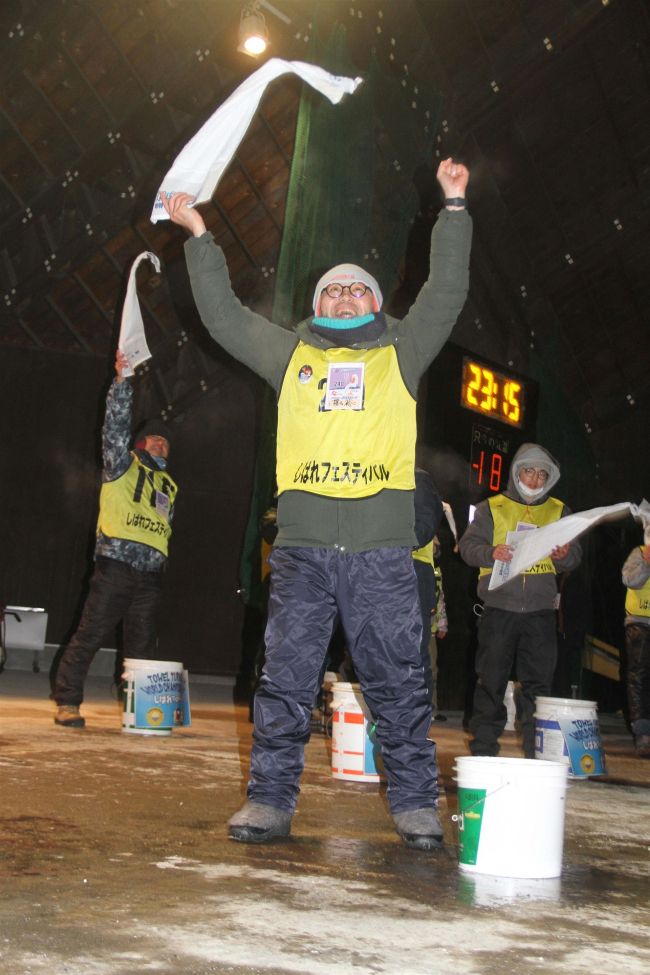 午後11時から始まった「世界タオル早回し選手権」。バケツの水に浸したタオルをぐるぐる回すと、一瞬で氷の棒に