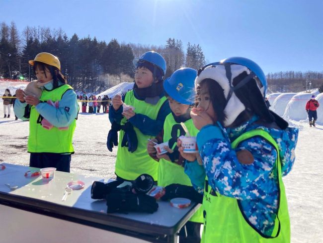 • 第40回を記念し復活した。雪山を走り、バルーンマンションを1基壊した後のゴール前最大の難関、「かき氷の早食い」。参加者は苦悶の表情を浮かべていた