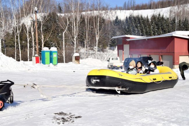 スノーモービルに引かれるゴムボートに乗り楽しんだ来場者。雪原を疾走し、陸別の冷たい風を体感