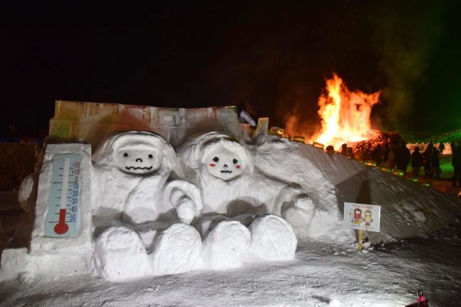 陸別町のマスコットキャラクター、しばれ君とつららちゃんの雪像。奥では来場者が暖を取れる「命の火」が赤々と燃え上がった