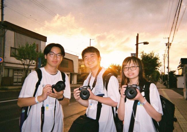 夕立に遭いながらファイナルの写真制作に臨む(左から)中原部長、高橋さん、保坂さん(白樺学園高校提供)