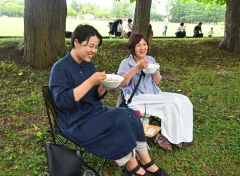 芝生にピクニックシートを敷いたり、400メートルベンチに座ったりして食事をする人の姿も目立つ。幕別町から娘の柊色(ひいろ)ちゃん(3)、楓禾(ふうか)ちゃん(10カ月)と訪れた根本舞さん(30)は、ベーグルやレモンスカッシュを味わい、「子育てのリフレッシュに来た。いろいろな店を一気に見られて楽しい。縁日もあって、子どもたちも喜んでくれている」とくつろいだ様子。