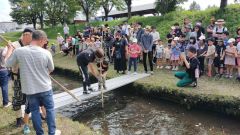 十勝最大のコタン(集落)があった伏古別で2017年から開かれ、今年で7回目。同川の一部に囲いを作ってサケを放流し、古くからの漁法が再現され、小学生と保護者ら約50人が参加した。