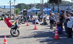 【広尾】米国の高級オートバイブランド「インディアン」のオーナーが十勝に集結し、広尾町までツーリングする交流イベントが23日に開かれた。ゴールの町役場駐車場ではプロのライダーによるテクニックショーが催され、見物客を魅了した。(能勢雄太郎)