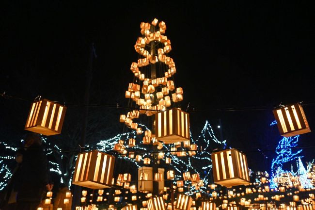 • 木製ランタンツリー今年のイルミネーションは木製ランタンを増強。無数のランタンを積み上げた「ツリー」が来場者の目を引いた