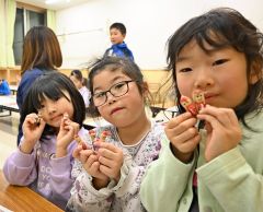 落花生は町の生産者で作る「メムロピーナッツ」が協賛。児童50人が制作に参加し、小さなかわいいサンタクロースができあがった。佐々木さんは「小学生の想像力に感心した。手作りの装飾が会場に並ぶことで、子どもたちがめむクリに来てくれるきっかけになれば」と期待を寄せる。
