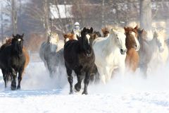初日は妊娠馬52頭にそれ以外の32頭を含む計84頭が3群に分かれ、1周800メートルの運動場をそれぞれ3周走った。前日から今朝にかけて雪が降ったばかりの走路を、重量のある馬たちが雪煙を上げて疾走した。