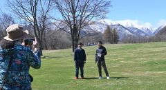日高山脈を背に、アースガーデン内で記念撮影をする来場者(20日午前10時5分ごろ)