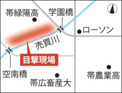10日午前6時20分ごろ、帯広市西19南41の売買川付近を散歩していた女性から「クマを見た」と、帯広署に通報があった。人や家畜などへの被害は確認されていない。付近には帯広畜産大学や帯広農業高校、さらには住宅地なども広がるため、同署や同市、道猟友会帯広支部などが厳戒態勢を敷き、市民らに注意を呼び掛けた。(松岡秀宜、北村里沙、高井翔太)