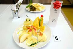 リンゴとグレープフルーツ、パイナップルを3人班は18分以内、2人班は21分以内の制限時間でカットした。学生たちは協力し合いながら練習してきた成果を発揮し、芸術的な盛り付けの作品を仕上げた。
