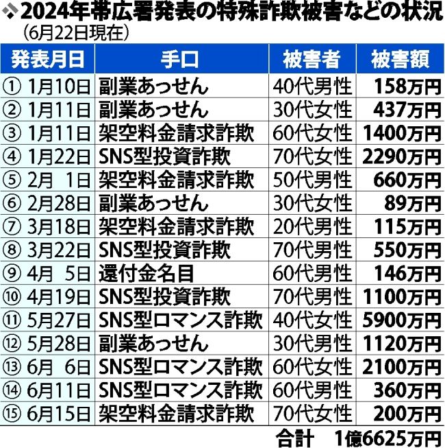 十勝管内で5月下旬から、SNSを使った詐欺被害が相次いでいる。道内も今年に入り5月末までの特殊詐欺とSNS型投資詐欺・ロマンス詐欺の被害額は11億円を超え、帯広署管内でも22日現在で1億円超と深刻だ。6月は道警の「SNS型投資・ロマンス詐欺の被害防止に向けた広報啓発強化月間」でもあり、同署刑事2課の佐藤寿哉課長は「詐欺の手口は移り変わりが早い。詐欺の知識をアップデートしてほしい」と注意を呼び掛ける。(菊地正人)