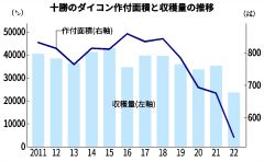 道農政部によると、管内のダイコン作付面積は2022年産で540・8ヘクタールと、過去10年で約35%減少。収穫量は2万3637トンで約42%減った。