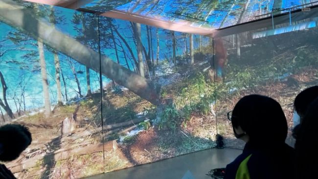 授業で使用した空間型VR「Uralaa(うらら)」は、浦幌町のIT企業「フォレストデジタル」(辻木勇二CEO)が手掛けたもの。今回は苗木の植え付けや伐採の様子をまとめた13分ほどの映像を、教室全体にプロジェクターで投影し、仮想現実をつくり出した。映像撮影には同町の「北村林業」が協力した。