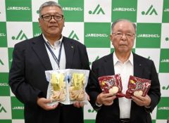 10日に同JA本部で記者会見を行い、有塚組合長や物産協会の木戸善範事務局長ら関係者が2商品を説明した。有塚組合長らは「どちらも豊富な栄養素を摂取できる。こうした加工食品市場を川西がけん引していければ」などと話した。