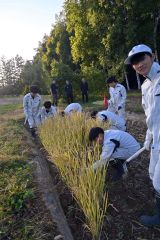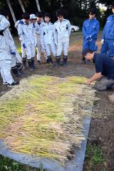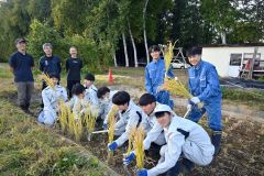 9月30日に収穫作業が行われ、生徒9人が鎌で刈り取り、乾燥させるため「はさがけ」した。活動を知った碧雲蔵杜氏(とうじ)の若山健一郎さんらも見守った。伊藤維恩さん(2年)は「机上でのかんがい排水の仕組みや必要性を実践で学べた」と笑顔。高山教諭は「初の試みで作業も手探り。結果、農薬を使わない自然栽培となったが、予想以上の実入りだった。来年以降も挑戦を続けたい」と話した。