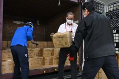 この日は、はがきを積んだトラック1台が午前9時前に同局に到着。初回便として96万8000枚が入った242箱のダンボール箱を、10人ほどの局員が各郵便局に運ぶためのパレットに積み替えた。