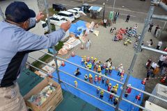 屋上から保育園児 笑顔で餅・菓子まき