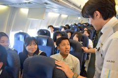 機内では、機長らが飛行高度や離陸・着陸の手順についてアナウンス。客室乗務員が業務内容を説明した。同校1年の吉川璃呂(りろ)さん(16)は「飛行機も空港も好きなので、進路の候補に航空業界があり、実際に見てみたいと思い参加した。説明を聞いて仕事内容を詳しく知ることができた」と話していた。