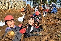 収穫にはPTAや保護者ら約20人も参加、穴掘りや作業の説明などに協力した。生産者で同校に種イモを提供した有塚利一PTA会長が「泥だらけになって収穫を楽しんでほしい。大きなナガイモが取れたことを家の人に教えてあげて」とあいさつ。寒川晄児童会長(6年)は「家に持ち帰りおいしくいただきましょう」と呼び掛けた。