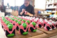 町が運営する同センターでは毎年、翌年の干支にちなんだ置物作りに取り組んでいる。今年は3月から型作りに入り、9月から窯焼きに着手。29日も同センターの職員が素焼きした置物に、筆を使って丁寧に絵付けを行っていた。