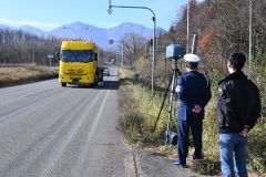 【清水】13日から始まる「冬の交通安全運動」(22日まで)を前に、道警十勝機動警察隊(十勝隊、箱崎和好隊長)、新得署(坂井一明署長)、門別署(相澤博昭署長)、北海道警察本部(道警本部、伊藤泰充本部長)は10~12日、「日勝峠・国道274号における交通事故抑止対策」と題し、同峠で速度違反の取り締まりを実施した。