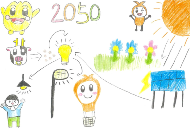 特別賞には町内から6点の応募があり、町民51人によるインターネット投票で決めた。二瓶さんは、牛のふん尿や太陽光から再生可能エネルギーが生み出されている様子を、愛らしいタッチで描いた。