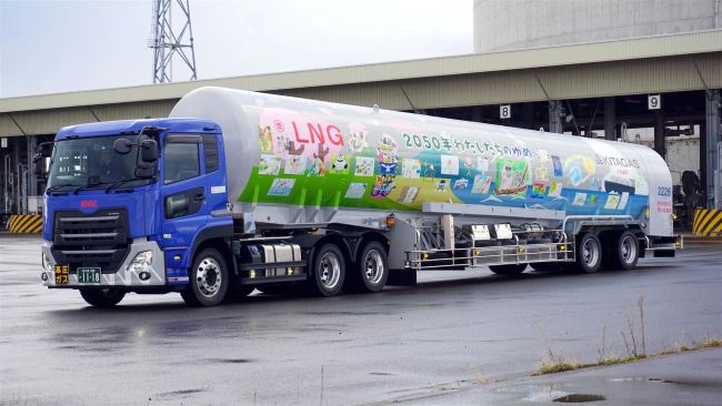 道内の小学生が描いた約65枚の絵で彩られたLNGローリー車は現在、北ガスの石狩LNG基地(石狩市)を拠点に旭川市や北見市などにLNGを輸送している。