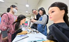 マネキンで髪をセット体験をする子ども(16日午前10時ごろ、帯広市のとかちプラザで。塩原真撮影)