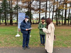 こうしたことから、15日には公園近くに交番がある帯広署員と協力し、野生動物を観察するこつのほか、餌付けの危険性も記載したリーフレット「アニマルウォッチングガイド」を来園者に配布した。またこれまでの禁止を強調した看板ではなく、「つかず はなれず エゾリス。」とプリントした適切な距離を取ることを促すのぼり14基を園内に設置。野生動物へのマナーを周知している。