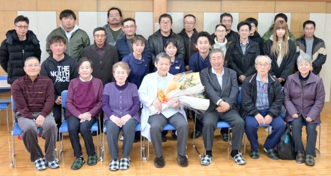 27日は、地域住民約25人が、診療所が入居する新和近隣センターに集まった。診療所での最後の診察を終えた景山医師に、小尾公区長と患者代表の筒渕照子さん(88)が「長い間、地域住民の健康のため、診療や往診を続けてくれてありがとう。今後は本院(景山医院)で診察をお願いします」と、謝意を伝えて花束を手渡した。