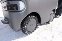 低速・小型の自動配送ロボットで初めて装着したオフロードタイヤ。滑りやすい雪道も力強く走行した