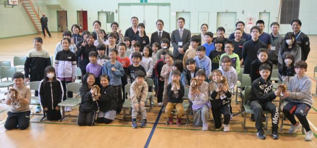 【幕別】幕別忠類小学校(浪内洋一校長、児童53人)と幕別忠類中学校(出村聖校長、生徒36人)が、忠類ナウマン象記念館や縫いぐるみ製造・販売の「AQUA(アクア)」(神奈川県)と連携して制作していた「忠類ナウマンゾウの縫いぐるみ」が完成した。忠類小学校で27日、贈呈式が行われ、児童らが縫いぐるみを受け取って完成を喜んだ。