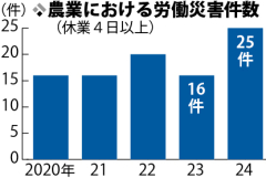 労災の分類上、「農業」は畑作のみで、「畜産業」は別の項目で集計している。25件はここ5年間で最多。内訳は「はさまれ、巻き込まれ」6件、「墜落、転落」5件、鎌などによる「切れ、こすれ」5件、ぎっくり腰などの「動作反動」3件など。