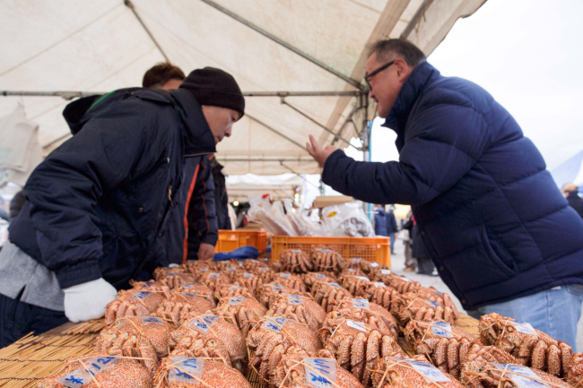 参加者に無色透明で、ほのかに甘みを感じられるシラカバ樹液を提供する川瀬さん(右)