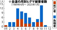 道内67件の内訳を月別でみると、10月(14件)、4月(12件)、5月(10件)、6月(9件)と続き、春と秋が多い。春は山菜採り、秋はキノコ狩りなど山に出掛ける人が増え、ヒグマも冬眠明けや、冬眠を控える秋に活発に動く。「ヒグマの生活圏に入る人が多くなる」(同振興局)ことから、遭遇する確率も高くなると考えられる。実際、67件の人身被害のうち、約半数の33件は山菜・キノコ狩りをしている最中の被害だった。