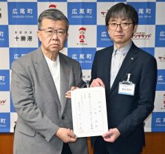 【広尾】広尾町は、港湾・物流業界に造詣が深い2氏を、広尾版観光大使「広尾町応援リーダー」に任命した。十勝港と釧路港-京浜港を結ぶコンテナ船定期航路が就航1年を迎えた一方で、今年3月には道内初の「産直港湾」に認定されるなど、十勝港が港湾・物流業界で注目を集める中、2氏には「十勝港活性化に向けた活躍を」(田中靖章町長)と期待する。
