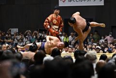 幕内の取組前には、土俵上の2人の力士が、相撲の禁じ手などをコミカルに実演するしょっきりも披露され、会場は笑いに包まれた。