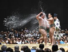 禁じ手などを滑稽に演じる「初切(しょっきり)」。山盛りの塩を顔にぶつけ会場は大盛り上がり